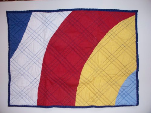 Aiden quilted standard size pillow sham from Pottery Barn Kids. Sham is 100% cotton and machine washable. Main colors are red, blue, yellow and white.
